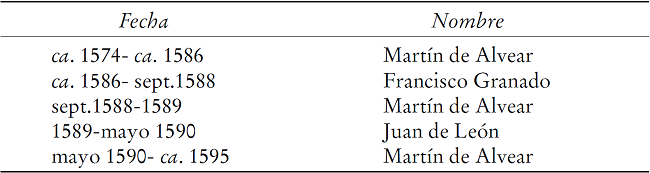 Cabe señalar que la década de 1580 estuvo marcada por cierta inestabilidad, ya que se multiplicaron los nombramientos provisionales, no sólo en razón de las suspensiones provocadas por el juicio de residencia del arzobispo Pedro Moya de Contreras, sino también a causa del fallecimiento de varios titulares. En estas circunstancias, la transmisión del oficio entre padres e hijos parece haber sido considerada como una opción satisfactoria, al menos de manera interina. Así, pues, en 1586 Luis de León fue nombrado para sustituir a su padre Diego de León, suspendido por Moya de Contreras. Sin embargo, tan sólo dos años después Luis de León tuvo que abandonar el cargo en favor de Francisco de Leiva, quien lo ocuparía hasta al menos 1610.57 La suerte de Bernardino de Leiva, en cambio, fue bastante diferente, puesto que recuperó el puesto dejado por la muerte de su padre Juan de Leiva y lo ocupó hasta su fallecimiento en 1624, momento en que fue sustituido por Andrés de Mejía.58 Por consiguiente, Alonso Hernández de Bocanegra, que había reemplazado a Juan de Leiva en 1586, tuvo que abandonar el cargo en 1587. No obstante, lo recuperó en 1588, cuando falleció Francisco Granado, que acababa de ser nombrado para sustituir a Alonso Solís de Aguirre.59