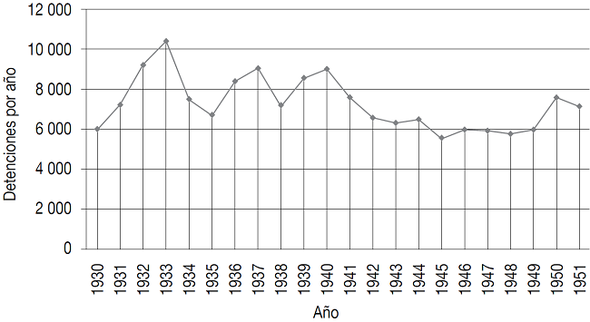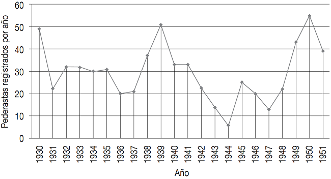 Pues bien, solamente en 651 de esos registros el reo fue inscrito como “pederasta”, lo que corresponde a 0.41% del total de las detenciones analizadas. Este dato nos indica que el control oficial era menos agresivo de lo que podría esperarse, con cierta distancia respecto a las narraciones amarillistas de la prensa que de cuando en cuando hablaban de continuas y violentas redadas policiales contra los “afeminados”. Una situación que en todo caso no niega la existencia de cierto riesgo en las calles que podía hacer vulnerables a los varones afeminados o a los participantes en prácticas homoeróticas. Sin duda éste era un factor que debían considerar quienes se arriesgaban a la socialización heterodoxa en el espacio público. El arresto de Vicente en marzo de 1930 es un buen ejemplo de esa vulnerabilidad. Sin embargo, resulta aún más interesante anotar que, si seguimos detalladamente el rastro de este tipo de detenciones, el sendero que se dibuja no es nada monótono ni estable (véase la Gráfica 1).