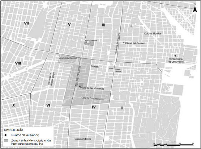 Escuchando a todo volumen Azucena envenenada, interpretada por Ernesto Riestra y su orquesta, prestaba sus servicios la Cervecería Elba en Uruguay 36.96 Asimismo, a pocas cuadras de la ya desaparecida Cuate, en Lucas Alamán 18, La Primera Lucha abrió sus puertas para que hombres -empolvados o no- bailaran de lo lindo con otros -mediara una ficha por cada pieza o no.97 Los dos lugares, que empezaron a funcionar por los años 1943 o 1944, proporcionarían un nuevo espacio para el encuentro festivo, y muy poco culposo, del deseo homoerótico.98 Mientras tanto, aunque algunos marchantes siguieron recorriendo los rumbos de San Juan de Letrán, los espacios de prostitución ubicados en los límites entre la Cuarta y la Quinta Demarcación de Policía, tales como la calle Santa María La Redonda, cerca de la Plaza Garibaldi -según vemos en los registros del Carmen-, fortalecieron su oferta homoerótica (véase el Plano 1).99