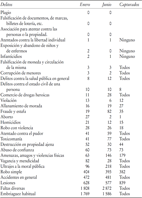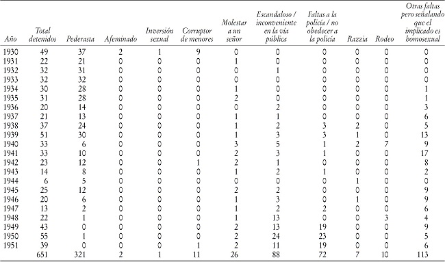 Aunque es posible especular que este tipo de arrestos podrían haberse ubicado en esa estadística en los renglones de corrupción de menores, de ultrajes a la moral pública, de atentados contra el pudor, o de vagancia, no tenemos certeza de ello. En cada uno de esos delitos podían caber transgresiones al orden cotidiano muy disímiles. Por ejemplo, mediante el cargo de ultrajes a la moral pública eran procesados desde los escandalosos hasta las parejas exhibicionistas, y por el de corrupción de menores, tanto los que inducían a la bebida u otros vicios a los más jóvenes, como los acusados de exponerlos a ambientes peligrosos. No tenemos entonces datos fiables sobre el comportamiento de los arrestos policiales para esa década.