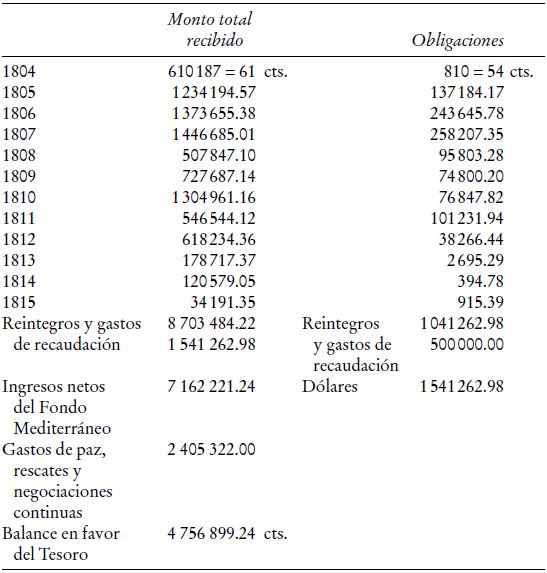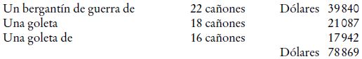 Los libros del Tesoro de los Estados Unidos indican que del 31 de marzo de 1789 al 31 de marzo de 1815 los gastos de mantener y rescatar cautivos, así como concluir la paz y continuar trajinando con los Estados de Berbería, ascendió a dos millones cuatrocientos cinco mil trescientos veintidós dólares; desde ese periodo nuestros gastos han sido insignificantes, destinándose tan sólo a los salarios de nuestros cónsules y otros cobros contingentes de los diferentes consulados, así como los acostumbrados regalos consulares que todas las naciones pagan cuando renuevan a sus cónsules. Mas esto no se puede aducir como criterio para formar un estimado del gasto probable que exigirían las negociaciones con Sudamérica; nosotros éramos un solo gobierno, pero [esas repúblicas] son seis y, al presente, poco conocidas en Berbería, y un hábil negociador puede representarlas bajo una luz más favorable a los intereses de sus empleadores sin temer mayor contradicción; además, nosotros teníamos trece embarcaciones de vela y ciento treinta y dos ciudadanos capturados por Argelia, y un navío por Túnez y otro por Trípoli, todo lo cual despertó su codicia, y derivado de las actividades de los agentes franceses y británicos que sistemáticamente se opusieron a los intereses de los Estados Unidos en el Mediterráneo, pudieron formar vastos proyectos de pillaje y rapiña, y en consecuencia incrementaron sus demandas al negociar la paz y la liberación de nuestros ciudadanos esclavizados, y al haberse establecido en Europa los fondos para efectuar nuestros diferentes tratados [se] volvió muy difícil cobrar sumas tan grandes en especie (dada la guerra casi universal que prevalecía entonces), y la pérdida por el canje fue muy grande, sumando a esto que los fondos no llegaron a tiempo, según las estipulaciones que los diferentes Tratados hacían conveniente para dar regalos adicionales en barcos de guerra, provisiones marítimas y militares, y joyería en una cantidad muy considerable, a fin de prevenir la reanudación de hostilidades, luego de haber concluido la paz durante muchos meses. Se presentó una fragata de 36 cañones a Argelia gratuitamente, a Túnez algunos relojes costosos, anillos de diamantes y armas ricamente adornadas, y a Trípoli se le prometió una goleta o bergantín de guerra de catorce cañones y una carga de provisiones marítimas y militares, todo valuado en sesenta mil dólares. Sin embargo, a mi arribo a Trípoli fui lo bastante afortunado como para negociar un pago en efectivo en lugar de lo anterior, liberando a los Estados Unidos de sus promesas de pagar en especie $19 500 y los usuales presentes consulares (que se pagan en ropa, relojes y joyería por todas las naciones cuando establecen un cónsul en cualquiera de los Estados de Berbería). Esto muestra cuán apropiado es viajar a dichos Estados proveído de fondos, ya que el Barhaw de Trípoli [aceptó] la suma señalada [puesta en su mano] en lugar de un regalo de tres veces el mismo valor, por el cual él habría tenido que esperar probablemente no más de un año, y cuyo flete por sí solo habría costado a los Estados Unidos más de lo que entregué en efectivo para amortizar lo prometido. Y en lugar del efectivo y las provisiones prometidas cuando concluimos nuestro primer Tratado, a [la regencia de] Argelia presentamos tres navíos de guerra construidos en Filadelfia, cuya construcción yo supervisé y [después] llevé a Argelia en 1798, y costaron a los Estados Unidos lo siguiente.