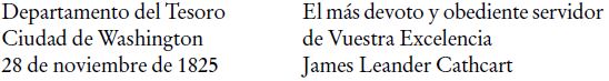 El anexo es una copia de la carta del comodoro Porter al ministro colombiano. De las referencias ahí aludidas pueden fácilmente dar cuenta los principales personajes de la Unión, entre los cuales están nuestros ex presidentes Messrs Jefferson y Madison y el Honorable James Barbour, actual Secretario de Guerra. Al gobierno mexicano respetuosamente se le remite a Mr. Poinsett, nuestro ministro ahí, al cual conozco bien, y al comodoro Porter, quien ha prometido encargarse de cualesquiera comunicaciones sobre este asunto que usted podría juzgar apropiado transmitir a su gobierno, al que tengo el honor de dirigirme.