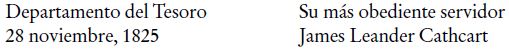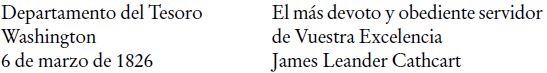Por el panfleto anexo se informará asimismo de que fui propietario y comandante del Independent en aquellos mares, y por tanto soy un comandante veterano, calificado para ir al frente de cualquier embarcación en tal servicio, o cualquier otro similar; y en el reporte del auditor del Tesoro al Secretario de Estado con fecha 6 de octubre de 1819, comenzando en la página 8, [consta] que reduje la suma inicialmente demandada a los Estados Unidos por el Dey de Argelia como precio por la paz y la liberación de cautivos, de 2 247 000 a 702 500 dólares, suma efectivamente acordada para ser pagada a Argelia, y que esto fue hecho en cuarenta y ocho horas, por lo cual los agentes de naciones extranjeras no pudieron obstaculizar la negociación, hallándose de hecho en cónclave para acordar medidas contrarias al logro de nuestra paz cuando [yo] icé la bandera americana, y la primera intimación que [ellos] recibieron de que las negociaciones habían comenzado fue el reporte del cañón disparado para saludar nuestra bandera [al momento de su] conclusión. Por los enunciados (vide) 42, 43, 44 del panfleto también verá la demanda de Portugal al Dey por la paz y el rescate de su gente esclavizada, mediante la intervención de Gran Bretaña, y otra información valiosa, relevante para esta materia, que es todo lo que al presente puedo darle, pues aunque tengo [un] diario [Journal] exacto de toda negociación que ha tenido lugar entre los Estados Unidos y las potencias berberiscas, y entre éstas y las potencias europeas durante medio siglo, es tan voluminoso y se halla entreverado con otros manuscritos, separados y dispersos, relativos a la historia de Berbería, que tomaría mucho tiempo y problemas ordenarlos y presentarlos como es debido.26