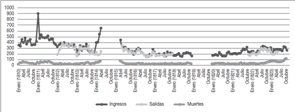Las cifras mensuales de entradas y salidas que muestra la gráfica 1 mantienen una regularidad en sus series, aunque existen vacíos de información.27 Cabe señalar que la capacidad del hospital, la de sus recursos económicos y humanos, deben ser valorados desde un entorno de guerra y epidemias. El hecho de que los ingresos repercutan en la misma estimación con las salidas, nos lleva a plantear algunas reflexiones: en primer lugar, la capacidad del hospital para albergar durante ciertos momentos a determinado número de enfermos, es decir, a mayores ingresos, mayores salidas. Recordemos que este recinto se construyó en 1794 y aun cuando tenía la capacidad suficiente para servir en los momentos de emergencia hospitalaria, la problemática que representó el periodo que nos ocupa rebasó el servicio brindado por la institución. Contexto que se caracterizó por el ingreso desmesurado de militares y civiles al hospital, situación que fue provocada por el movimiento armado de 1810 y por los estragos que causaron la presencia de dos epidemias: tifo de 1814 y viruela de 1815.28 Este escenario se manifestó en la ciudad como un grave problema de salud y de muerte; el actuar de las autoridades fue rebasado y las medidas implementadas no lograron reducir las consecuencias mortales de la epidemia, al menos la de tifo de 1814.29 En el hospital sucedió lo mismo, el problema se reflejó no solo con los enfermos y espacios que se acondicionaron para su atención, sino con las defunciones registradas a causa de estos periodos de sobremortalidad; en segundo término, el personal que requería el hospital debido al desmesurado ingreso de convalecientes; esta situación demandó ampliación de los servicios y de personal. No olvidemos que durante este periodo el hospital era administrado por personal civil a cargo de la Real Audiencia; no contaba con la noble labor ejercida por los betlemitas, religiosos que se caracterizaron por su vocación de atención a los enfermos.30 Y, finalmente, poner énfasis en cómo el hospital careció de los recursos económicos suficientes y del personal adecuado que asegura la administración y el servicio hospitalario.