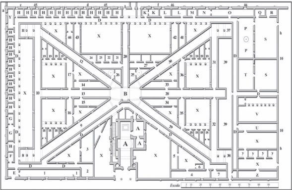 El eje de estudio para analizar la organización terapéutica y el funcionamiento que presenta el espacio hospitalario de San Miguel se determina mediante el cruce del nombre de la sala y el nombre de la enfermedad. Los diferentes espacios o salas que conforman la Nueva Fábrica de Belén se visualizan en el plano 1.