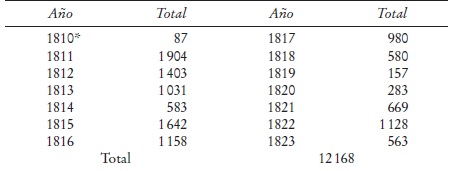 Los registros de militares que presentó el hospital entre 1810 y 1823 alcanzaron un estimado cercano a los 12000 ingresos, la mayoría españoles. Situación que sin duda alteró las dinámicas del recinto y la eficacia del servicio. Aunque este fenómeno es más claro durante enero de 1811 (véase la gráfica 1), momento en que aumentan los ingresos con cerca de 900 entradas tan solo en ese mes, de las cuales un aproximado de 303 corresponden a militares de diferentes regimientos. Sobre la situación que presentaron las huestes en la ciudad a inicios de 1811, Olveda señala: