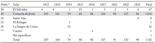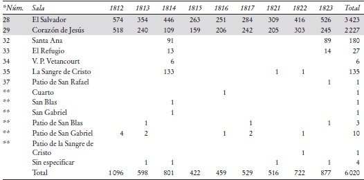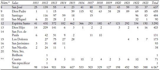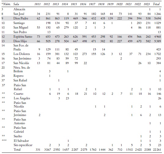 Durante el período de estudio que se propone (1811-1823), la consigna del nombre de la enfermedad y del nombre de la sala están casi completos y resultan trascendentales para los fines del presente trabajo. El cruce de estas variables explica los criterios que rigen la organización terapéutica y el funcionamiento del espacio hospitalario de San Miguel. Pese a que el estudio de este fenómeno solo se puede abordar durante cierto periodo en donde la fuente registra la sala y la enfermedad, específicamente desde noviembre de 1811 hasta finales de 1823, año en que deja de anotarse el nombre de la sala, representa un instrumento de análisis que, desde el interior del propio hospital, explica el funcionamiento que presenta la institución hospitalaria a fines de la época colonial.