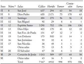 Los padecimientos más frecuentes registrados en este cuadro alcanzan 85% de los 28 281 registros nominales capturados. Aunque la presencia de los males es común en todos los grupos sociales, su distribución no es uniforme; en algunos casos el grado de virulencia es más recurrente para determinados sectores. Los malestares presentan una sintomatología asociada por diversas causas, resaltando las generadas por conductas sexuales (gálicos 25.3%) y las infectocontagiosas de las vías respiratorias y gastrointestinales (fiebres 24.9%). Estos convalecientes se distribuyeron a lo largo de las salas (véanse los cuadro 5 y 6).