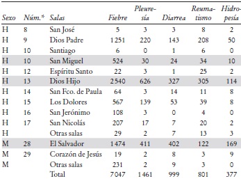 De acuerdo con el plano núm. 1, Dios Hijo (núm. 13) se destinó para atender este mal. Este casi 50% de internamiento denota la aplicación de mecanismos que rigieron el funcionamiento interno de algunas áreas del hospital, en este caso, debido a la fiebre y su carácter infectocontagioso que la representaba, mismo que era desconocido por los empleados del hospital. En mujeres la atención se concentra en El Salvador (núm. 28), con 85% de los ingresos; aun cuando no fue concebido por el plano de 1792 como una de las piezas destinadas para ese mal, se adaptó a la problemática del momento.