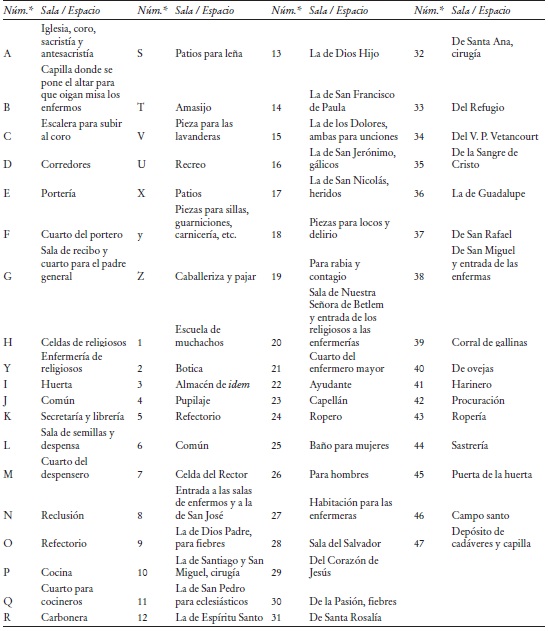 El Nuevo Hospital de San Miguel tenía “un total de 22 salas y 20 piezas, separadas por sexo”.33 De acuerdo con Oliver, la disposición que presentan las salas tiene su origen en los hospitales cruciformes de la Edad Media,34 como el antecedente de la planta radiada y como el tipo de arquitectura que a finales del siglo XVIII matizó el carácter religioso del hospital,35 además de traslucir el ejercicio espiritual que caracterizó a los betlemitas en la asistencia de enfermos. 36 El recinto tenía “775 [camas...], y lugar para poner otras”,37 se destinó para asistir diversos padecimientos de la población: enfermos de fiebres, gálicos, heridos, locos y delirio, etc. Incluyó dos escuelas (de escribir y leer), cocina, panadería, habitaciones de religiosos, ropería, baños, botica, patios internos, cementerio y otros espacios no considerados en el plano.