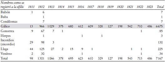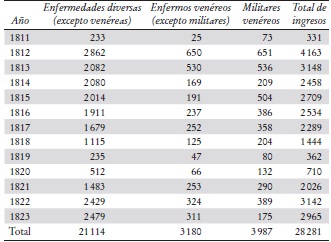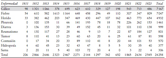 En el análisis realizado a la fuente se constata que desde fines de 1811 se anota el nombre de la enfermedad de forma regular en cada registro de ingreso del Hospital de San Miguel. Esta razón justifica el inicio de nuestro periodo de estudio y culmina en 1823 porque después de este año los registros que se anotan en los libros de entradas y salidas del hospital son irregulares. Esta circunstancia impide realizar un estudio de largo plazo en los registros de enfermos y en los de mortalidad.