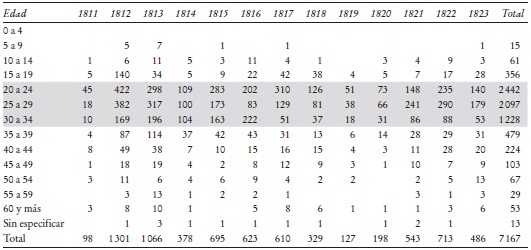 Esta población representa a 78% de hombres y el resto a mujeres. Aunque los militares, en su mayoría españoles, tienen presencia significativa con 36%31 de todos los registros, y es lo que explica, aunado a la falta de datos durante algunos años para el caso de la mujer, la gran diferencia numérica entre ambos sexos y con el resto de las calidades. Respecto al tema de la calidad, es necesario mencionar que el contexto de la guerra de insurgencia y la presencia de realistas en la ciudad influye notablemente para que esta categoría se sobredimensione con el caso de los españoles. Este dato deja de registrarse en 1821 y hasta ese año alcanza un estimado cercano a 50% para los españoles, en comparación con los mestizos e indios que representan 36 y 12%, respectivamente.32