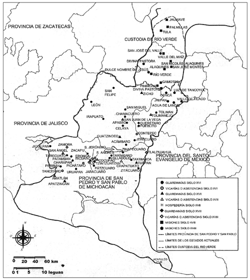 El aumento en el número de conventos y ministros religiosos en Michoacán y Jalisco permitió que un territorio amplio al occidente de la Nueva España fuera elevado a custodia, al mismo tiempo que la custodia del Santo Evangelio adquirió la categoría de provincia. De manera oficial, en la bula del 11 de agosto de 1536, el papa Paulo III erigió la diócesis de Michoacán y la custodia de los Santos Apóstoles San Pedro y San Pablo de Michoacán y Jalisco.20 A partir de entonces, la custodia de Michoacán tuvo jurisdicción propia, pero en los asuntos de relevancia seguía dependiendo de la provincia del Santo Evangelio de México. Su jurisdicción abarcaba el actual estado de Michoacán, Jalisco, Nayarit, Colima, Guanajuato, Querétaro y parte de Guerrero, mientras que hacia el norte, la frontera se encontraba abierta hacia Sinaloa, Zacatecas, Durango, Nuevo León, una fracción de San Luis Potosí y Tamaulipas. Según Espinosa, su extensión era de 360 leguas de longitud por 150 de latitud -aproximadamente 2 005.9 km × 835.9 km-; un territorio demasiado amplio para el número de predicadores disponibles.21