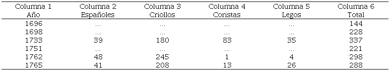 A finales del siglo XVII, el provincial fray Pablo Sarmiento informó que el convento sede de la custodia de Santa Catarina tenía claustro y celdas suficientes para 4 religiosos; que los indios eran de nación otomí y que había otros pueblos en la misma custodia de nación chichimeca y pames. Por todos, dice, son 60 familias, 6 estancias de españoles, mestizos y mulatos, de las cuales da detalle.76 En cuanto a la provincia de San Pedro y San Pablo, un informe de 1696 emitido por el mismo padre Sarmiento indicaba que las doctrinas de dicho territorio eran 29, las vicarías 13, una custodia con 5 misiones y una hospedería, la de Acapulco.77 De acuerdo a una relación de este tiempo, la provincia de Michoacán tenía 144 religiosos,78 aunque otro informe indicaba que eran 228, que atendían 42 casas y 2 misiones.79 Es posible que la diferencia se deba a que en la segunda se incluían coristas y legos, como se hizo unas décadas después, en 1733, cuando se informó que los religiosos sumaban 337, según una nómina, de los cuales 39 eran españoles, 180 criollos, 83 coristas y 35 legos.80 En 1751 se contaban 221 religiosos,81 y en 1762 se registraron 298 frailes, 53 españoles y 245 criollos. Entre los españoles se contabilizaban 48 sacerdotes, corista y 4 legos; de los criollos, 199 eran sacerdotes, 19 coristas y 27 legos.82 Tres años después se tenían 41 españoles, 208 criollos, 26 legos y 13 novicios, que sumaban un total de 288 religiosos (ver tabla 1).83
