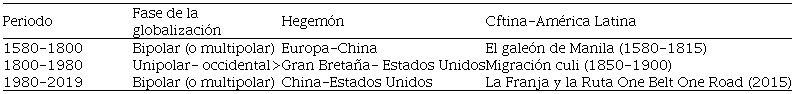 Por su parte, la migración de culíes hacia América Latina se desenvolvió cuando la globalización adquirió un perfil unipolar-occidental, siendo primero Gran Bretaña y luego Estados Unidos los dos polos económicos. Por entonces, China se encontraba en crisis y retroceso, donde los fenómenos característicos fueron: los conflictos y guerra internas, un proceso de ruralización y desindustrialización, desmonetización y una punzante intervención occidental en su vida interna. Por último, el tercer fenómeno económico que hoy en día está en pleno desarrollo comenzó hace 50 años. Aquella propuesta estratégica de la nueva ruta de la seda entre China y América Latina se inscribe en un retorno de la bipolaridad global, donde la hegemonía de Estados Unidos se encuentra seriamente cuestionada por el ascenso de China. El marcado proteccionismo que aplica actualmente el gobierno de Donald Trump es, en última instancia, el método de resistencia de ver a China como bastión y principal nación defensora de la globalización neoliberal.