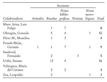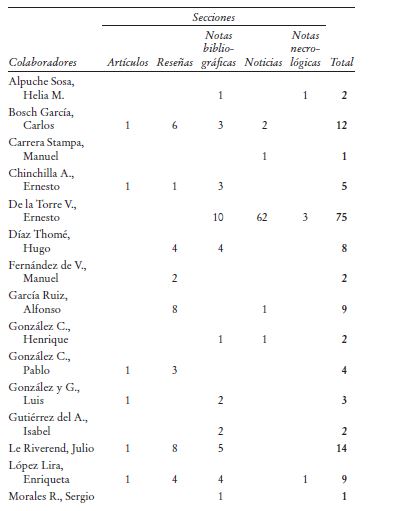 Así, y a riesgo de pasar por alto algún nombre,20 podemos decir que este grupo estuvo conformado por 23 estudiantes (mexicanos y extranjeros) pertenecientes a las primeras generaciones del CEH, número no menor si consideramos que representa el 74% de esa población estudiantil.21 Si observamos en el apéndice la cantidad de colaboraciones por sección, se comprende que no todos se involucraron con la misma intensidad ni en el mismo tipo de trabajo. Los que entraron de lleno a la revista fueron: Ernesto de la Torre Villar, Hugo Díaz Thomé, Carlos Bosch, Alfonso García Ruiz, Julio Le Riverend, Enriqueta López Lira, Luis Felipe Muro Arias, Gonzalo Obregón, Germán Posada Mejía y Susana Uribe.