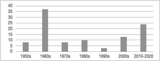 En la revista han aparecido alrededor de 70 artículos sobre la Reforma, la Intervención y el Imperio; en promedio uno al año. No obstante, como ilustra la gráfica 1, los sucesos y procesos que marcaron estos años turbulentos interesaron a los investigadores de manera intermitente, acicalados, a menudo, por el imperativo de la conmemoración. Empero, no todos los aniversarios merecieron un lugar en el programa editorial de Historia Mexicana. En la década de 1950, ni las leyes reformistas del gobierno de Ayutla, ni el congreso que dominaran aquellos hombres que, según Luis González, “parecían gigantes”, ni el estallido de la Guerra de Reforma, ni la legislación radical de 1859-1860 se discutieron en Historia Mexicana, con todo y que cumplían 100 años.