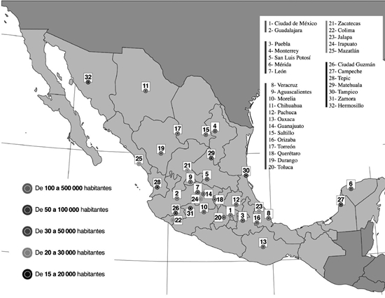 En conjunto, en los años finales del porfiriato, 28% de la población del país residía en localidades de más de 2 500 habitantes y una red de 20 ciudades de más de 30 000 pobladores se articulaba sobre el territorio (véase el mapa 1).31 Fueron años definitivos en el cambio de ropajes de las ciudades: se amplió la plantación de alamedas y la modificación de muchas plazas por unas de gusto burgués; se llenaron las calles de alambres de telégrafos, teléfonos, electricidad y tranvías; se construyeron edificios más acordes a los principios de salubridad (panteones, rastros y hospitales), y aparecieron o se multiplicaron por las calles comerciales nuevos giros: ferreterías, relojerías, joyerías, bancos, hoteles, almacenes de ropa, restaurantes, abarrotes importados, estudios fotográficos, cines, cervecerías, expendios de petróleo, neverías, salones de patinar, boliches, hipódromos o distribuidoras de materiales para construcción, hasta automóviles.32