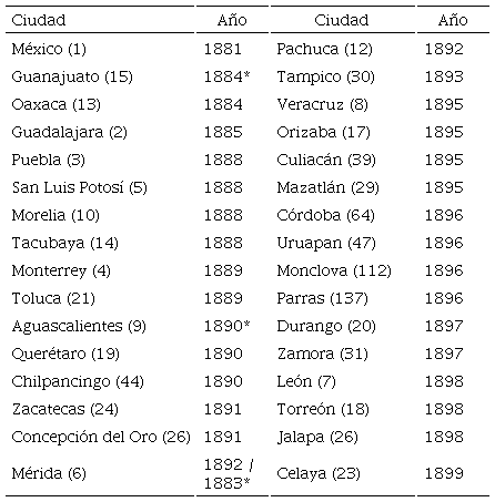 Los momentos y las circunstancias de introducción fueron muy variables. Guanajuato y Oaxaca, que ocupaban un lugar intermedio entre las ciudades más pobladas, contaron con algunas lámparas eléctricas en sus calles poco después que la ciudad de México. Veracruz, el puerto principal del país, las tuvo hasta 1895, apenas un año antes que Córdoba, que tenía una población mucho menor. Pachuca, a pesar de la importancia de sus minas, no tuvo servicio para la ciudad sino a partir de 1892. En la tabla 1 no se enlistan otras capitales o ciudades importantes, como Chihuahua, Saltillo, Colima o Irapuato, pues a pesar de que contaron con la instalación antes de 1899, no sabemos la fecha con precisión.
