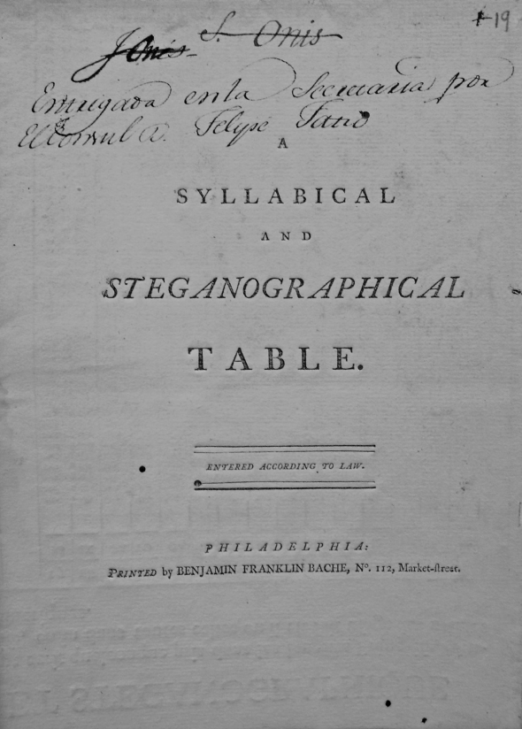 Ante todo, es preciso abordar varios datos bibliográficos fundamentales en relación con esta “tabla esteganográfica”. Las copias disponibles que se han catalogado en Estados Unidos y Australia, todas impresas, son escasas. Joseph Galland refiere un ejemplar de la colección Fabyan de la Biblioteca del Congreso en Washington, D. C., en el cual consta a lápiz la breve inscripción “ca. 1768”.1 Se describe otra tabla formal y materialmente idéntica en el catálogo de la colección que legó el memorable criptoanalista William R. Friedman; es el ítem 265, y se nos dice que Friedman lo adquirió del negociante de libros W. De Witt en Filadelfia, estimándolo como de “gran interés e importancia histórica”. En la misma ficha se asienta como fechas probables ante quem y post quem de creación los años límite “1786-1798”, y también que un ejemplar firmado por Wouves consta en la Biblioteca Pública de Nueva York, mientras otro, no firmado, lo resguarda la Sociedad Histórica de Filadelfia (aquí, contradiciendo a Galland, se niega la existencia de copias en la Biblioteca del Congreso.) La firma aludida en el impreso de Nueva York se lee “P. R. Wouves”, justo como la que luce en el del AGN. La descripción acaba en el siguiente apunte: “De Witt pensaba que Wouves era un pseudónimo de Benjamin Franklin. El impresor (publisher), Benjamin Franklin Bach, era su nieto. Sabemos que Franklin [el abuelo] usó cifras. P. R. = ¿Poor Richard?”.2 Esta última pretendida coincidencia se entiende al recordar que el patriota, político, diplomático, científico e impresor Benjamin Franklin publicó anualmente, entre 1732 y 1758, un compendio literario de misceláneas con el título Poor Richard’s Almanack, que firmaba o bien como “Poor Richard” o bien como “Richard Saunders”.