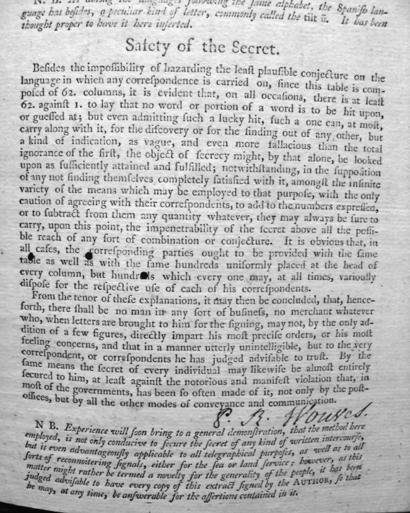 N. B. La experiencia pronto traerá una demostración general de que el método aquí empleado no sólo es conducente a la seguridad del secreto de cualquier clase de intercambio por escrito, pero es incluso ventajosamente aplicable a todo propósito telegráfico, así como a toda clase de señales de reconocimiento para servicios ya por mar, ya por tierra; sin embargo, en tanto esta materia podría más bien estimarse una novedad por la generalidad de la gente, se ha juzgado recomendable tener toda copia de este extracto firmada por el Autor, de modo que él pueda, en cualquier momento, responder por los asertos que contiene.