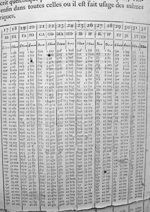 Cualquiera que despliegue esta tabla como es habitual hacer para utilizar un mapa geográfico puede, por medio de las letras iniciales y de los números que corresponden a las columnas alfabéticas, situar de una sola mirada cualquier palabra o porción de cualquier palabra requerida, y convertirla inmediatamente en figuras [numéricas].
