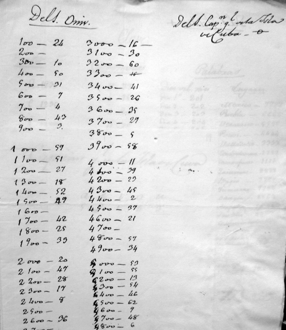 Este folio, como es evidente, se preparó para mostrar el quantum de las columnas en donde una determinada centena gobernaría la codificación mediante la suma de esa centena con el número de renglón donde constaba la sílaba o fragmento de palabra a convertir a grupos numéricos, de acuerdo con las estipulaciones de Wouves (véase la explicación supra). Es indicativo de las “contracifras” que utilizarían dos usuarios, el “Sr. Onís” (columna de la izquierda) y el “Sr. Cap.n g.l [Capitán general] de la Isla de Cuba” (columna de la derecha) para la decodificación de sus mutuas transmisiones encriptadas. Sólo se han desplegado los índices para la tabla de Onís, quedando suponer que los de Cienfuegos serían agregados posteriormente, cuando éste los enviara luego de haber recibido los valores que utilizaría el virrey Apodaca, justamente los que aparecen inscritos en nuestro documento de referencia. Lo cierto es que, en el listado de Onís, advertimos con total claridad cómo el conteo centenario inicia en 100 y progresa de 10 en 10 hasta culminar en 6200, acusando con exactitud la conformación de la tabla según el número de columnas y el de renglones o líneas. Este dato técnico favorece en extremo la hipótesis de que el criptosistema debió ser el ejemplar de la tabla resguardado en el AGN. Porque conviene saber que en el mismo fólder consta un segundo criptosistema, pero es muy diferente a la tabla en muchos aspectos, comenzando por el método de su arreglo formal, y si esto es así, entonces las prescripciones de manejo serán inconmensurables criptológicamente con los de la tabla. Pero que no puede haber lugar a confusiones lo garantiza la crítica interna tanto de ese segundo método como de la documentación aneja, por donde aprendemos, fundamentalmente, tres cosas: 1) el sistema es de sustitución simple monoalfabética, parecido a los clásicos nomencladores por la combinación de un alfabeto de definición con guarismos de sustitución para vocales y consonantes con un diccionario de guarismos-código para encubrir nombres de meses, días de semana, años, personajes de alto rango y sitios topográficos; 2) su creación respondió a una orden directa del Ministerio de la Guerra en la península al virrey Apodaca, luego ni Onís ni Fatio estaban en posición alguna para intervenir en su generación, y 3) aquella orden y el pliego con el criptosistema fueron ambos remitidos a sus destinos particulares entre junio y noviembre de 1817.