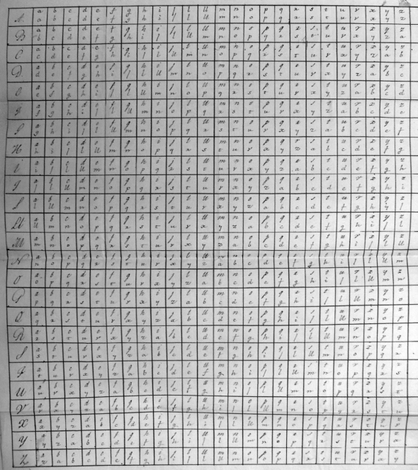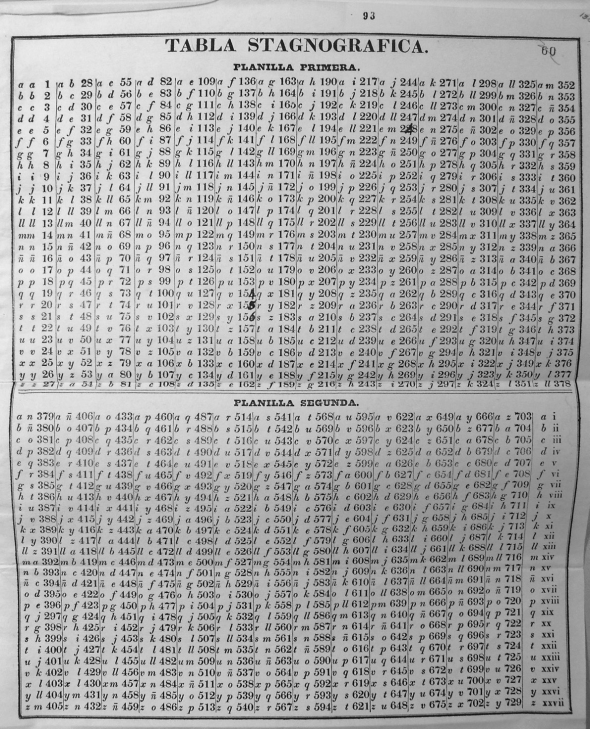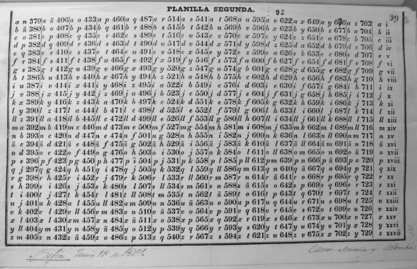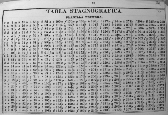 Ahora, la modificación fundamental que se hizo a este modelo para crear la “Tabla Stagnográfica” consistió en convertir columnas en renglones. En efecto, si el lector observa las figuras 6, 7 y 8 y abstrae de ellas todos los guarismos más la columna en la extrema derecha de la “Planilla segunda” (figura 8), hallará que, tomando como ejemplo la primera columna de la tabla Alamán-Michelena (esto es, la inmediata a la derecha de la columna con mayúsculas), las combinaciones a/a, a/b, a/c, a/d, etc., se presenta como la fila que inicia en a a y termina en a z, considerando que el total de las letras alfabéticas se distribuyó en dos “planillas” por razones de comodidad práctica.38 De este modo, el mapa completo de las grafías en la tabla de 1824 se mantuvo idéntico en cuanto a pareos, pero no en ordenamiento, en las 27 columnas y 54 renglones de la tabla de 1831.