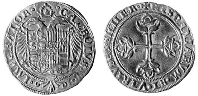 La principal característica de las nuevas monedas de oro, que a partir de 1537 sustituyeron definitivamente al ducado de oro en el sistema áureo castellano, era que, además de tener el escudo de la casa de los Habsburgo, tenía la cruz de Jerusalén (figura 1), situada en el lado opuesto; este particular icono fue colocado en estas primeras monedas probablemente para dar una connotación incluso religiosa a esta nueva fabricación de moneda, por la cruzada que se iba a poner en marcha contra Barbarroja y el Turco.