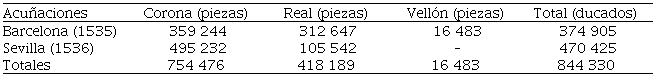 El valor del tesoro ingresado a Enciso y Ayala de la acuñación hecha en las atarazanas de Sevilla en 1536 ascendió a 179 414 316 maravedís, o 478 438,2 ducados, y procedió principalmente del metal precioso requisado en 1535 y 1536 a los conquistadores que regresaron de las hazañas peruanas. El tesoro fue valorado en 168 556 050 maravedís, según el cargo que de dicho tesoro hicieron los funcionarios nombrados para dicha tarea, Juan de Enciso y Diego de Ayala.27 Acabada la fabricación de piezas, resultó que recibieron los dos oficiales 495 232 coronas de oro y 105 542 reales imperiales de plata, del valor de 1/12 de corona, por un total en unidad de cuenta de 179 414 316 maravedís o 470 425 ducados (tabla 1), con la parte restante que sirvió para los costes y pérdidas de acuñación, quedando un pequeño alcance a favor de los dos oficiales de 86.3 ducados.