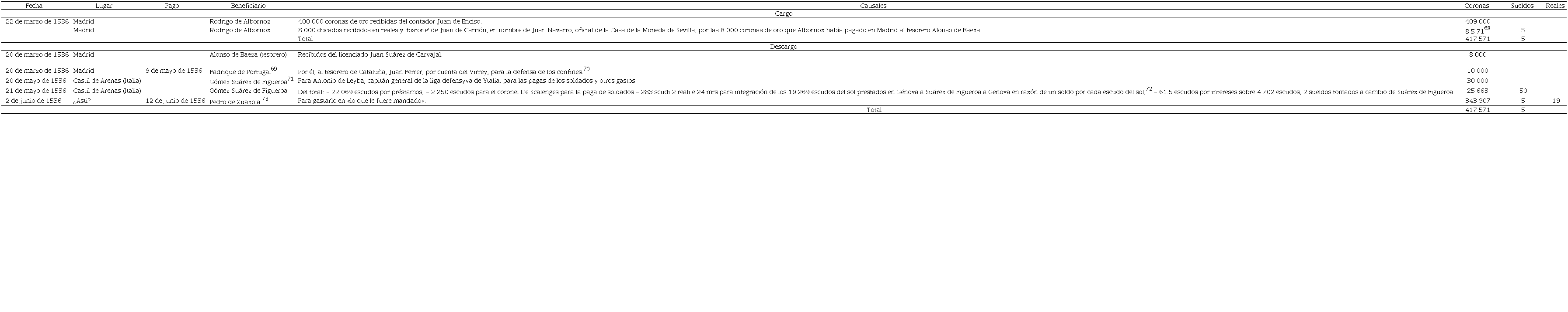 Cargo y data de las coronas recibidas y pagadas en 1536 por rodrigo de albornoz, contador de la nueva españa, destinadas a la campaña de piamonte y provenza (valores en coronas o escudos imperiales)