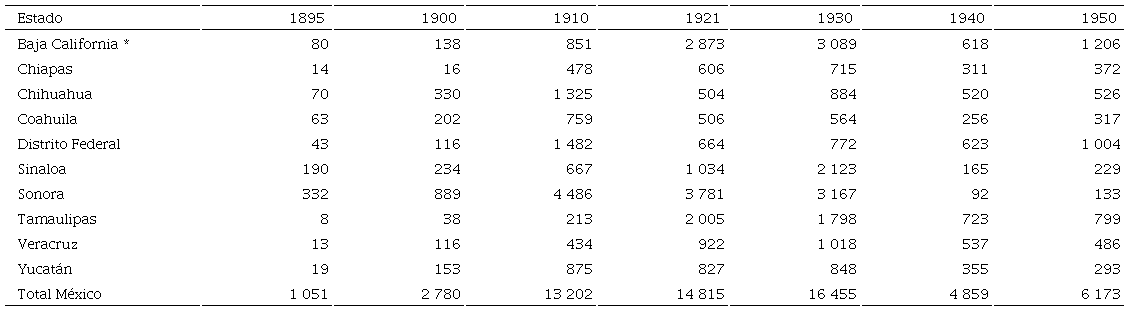 Los primeros chinos llegaron a Sinaloa a mediados del siglo XIX. Hay noticia de que José Wong Song estableció una sastrería en Mazatlán en 1841, pero en las siguientes décadas fue seguido por pocos paisanos. En 1885 el gobernador Francisco Cañedo informó que en todo el estado había 45, mientras que el primer censo de la República, en 1895, consignó 190.8 Desde entonces y hasta 1930, su número aumentó rápidamente (véase el cuadro 1).