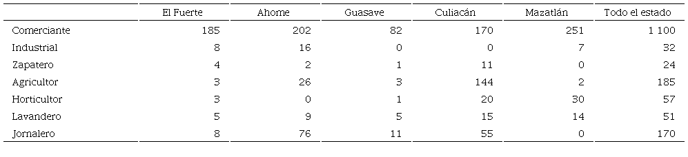 Estos números, si bien confirman la idea de que el comercio se convirtió en su ocupación predilecta, también indican una fuerte orientación hacia la agricultura, en parte como jornaleros, pero sobre todo como pequeños agricultores y horticultores, lo que repercutió en un mejor abasto de verduras y legumbres en los mercados locales. En Mazatlán y Culiacán inicialmente las entregaban a los verduleros nacionales, pero después decidieron venderlas directamente. Además, habían comenzado a cultivar tomate, aunque en este caso su producción no tenía importancia frente a la de los agricultores nacionales.17 Por lo que toca a los jornaleros, se concentraron en Ahome, Los Mochis y Culiacán, lugares donde era muy importante el cultivo de la caña de azúcar y el tomate.