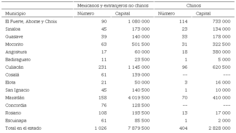 Aunque en términos absolutos los chinos estaban detrás de los otros comerciantes, los promedios de capital por unidad comercial eran muy parecidos, 7 679 pesos en el caso de los mexicanos y extranjeros no chinos y 7 000 pesos en el caso de los chinos. Estas cifras han sido confirmadas por las investigaciones recientes de Mayra Vidales sobre Culiacán y Arturo Román sobre Mazatlán. La primera usó los archivos notariales y encontró que entre 1900 y 1920 ningún negocio chino registrado ante notario superó los 8 000 pesos de capital; sólo alcanzó esa cifra la sociedad mercantil Chan, Sam y Cía., formada en 1919. Pero también encontró que varios de estos pequeños empresarios chinos, con el paso del tiempo, tendieron a invertir sus modestos capitales en más de una empresa.19 Por su parte, Arturo Román halló que entre 1905 y 1931 se registraron 30 empresas, de las cuales solamente dos pasaron de 30 000 pesos, y dos más declararon un capital de 20 000 pesos. Las más importantes fueron Yuen Fo Sam y Cía., que declaraba 30 000 pesos de capital en 1925, y Ley Hermanos, formada con 35 000 pesos en el mismo año y reconstituida en 1931.20