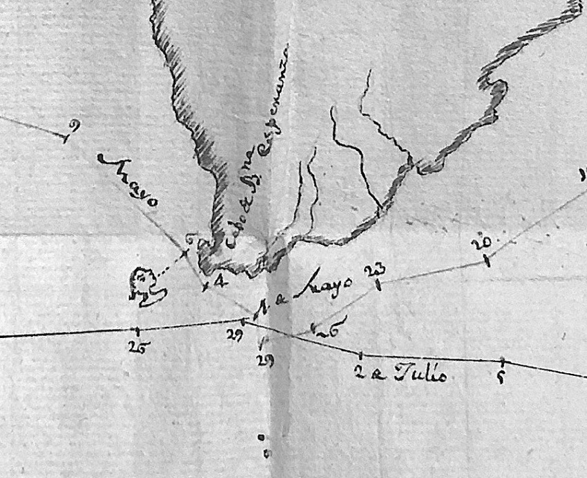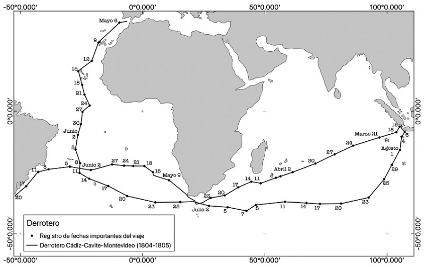 Los documentos en primera persona, particularmente diarios de navegación y piezas cartográficas, son obra de la pluma del propio Latre para la Sección Hidrográfica de la Real Armada. El documento capital es el que elaboró de la singladura entre Cádiz y el puerto de Maldonado, como testimonio de las contingencias de la guerra y donde quedan destacadas los derroteros de ida y vuelta.19 Es relevante el episodio relativo al señalamiento de la noticia recibida en altamar sobre la guerra contra los británicos, que modificó su ruta de Cádiz al Río de la Plata, como veremos adelante.20