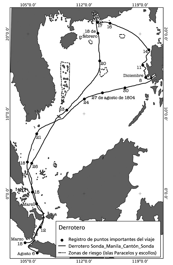 Un solícito Latre se puso a las órdenes del comandante general de Marina don Tomás de Ugarte, y “en el termino de ocho a nueve días lastró el Buque, lo concluyó de aparejar y dio la vela para el puerto de Sisyrán [sic], en la contracosta de La Luconia”.38 Latre se aventuró haciendo el recorrido sin ayuda de “práctico” desde la contracosta y el cruce del estrecho de San Bernardino, de la que hizo un reconocimiento cartográfico, “teniendo una grande confianza en el Buque de su mando, y su buena tripulación […] emprendió por si solo el viaje a Manila y después de 20 días invertidos en espiarse y darse bordos, cuando el viento dio lugar” llegó a fondear en la Bahía de Manila el 27 de diciembre de 1802 sin avería de consideración, después de diez meses de travesía y habiendo arriesgado su navegación, pero dando con una nueva ruta al sur de la línea de navegación ecuatorial (véase el mapa 1).