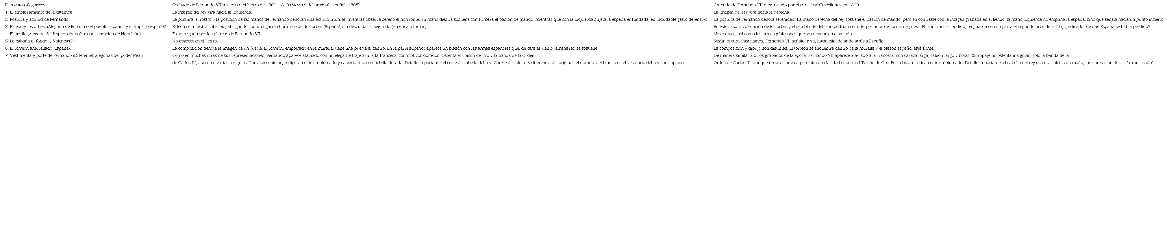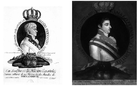 Al observar con detenimiento ambas efigies sería difícil no cavilar que la representación de Fernando VII que aparece insertada en el lienzo de las autoridades indígenas (1809-1810), así como la estampa que escandalizó al sacerdote José Castella nos (1809), tuvieron un mismo origen en la imagen conmemorativa grabada en España a mediados de 1808. Cada una exhibida con diferentes variantes en el estilo, forma y elementos decorativos e iconográficos que podían sustentar uno o varios mensajes dependiendo de la óptica, cultura literaria y sensibilidad de los receptores. En ambos casos se perciben esas diferenciaciones: