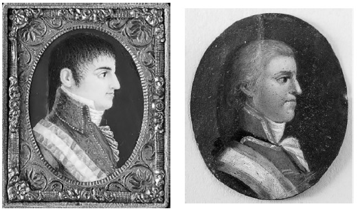 Como ha podido observarse, la evolución artística de la imagen de Fernando VII en la Nueva España involucró la definición, y adecuación, de ciertos patrones estéticos y simbólicos para diferenciar su efigie principesca de la efigie monárquica. Es posible conjeturar que tal circunstancia se suscitó debido a que los retratos oficiales no llegaron a América a tiempo por diversas razones.95 En todo caso, muchas de estas estampas fueron reutilizadas y reconfiguradas, añadiéndoseles elementos decorativos, insignias y color dependiendo de las peticiones hechas al artífice o sugeridas por él mismo. De hecho, algunos de estos artífices reutilizaron y compusieron en diferentes tamaños los grabados y retratos europeos para que el portador tuviese facilidad de transportarlos96 y procurarles personal devoción; e incluso, tal como lo solicitó el virrey Pedro Garibay, para “portarlo como relicario, o tejerlo en los vestidos, sombreros, banderas y pendones para así manifestar su fidelidad y amor”97 (véanse las imágenes 16 y 17).