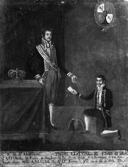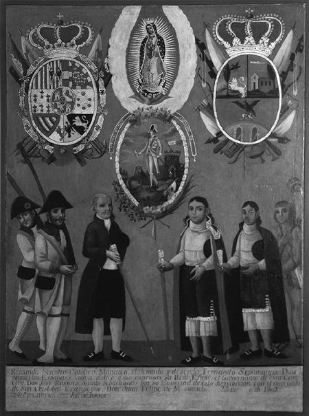 Finalmente, como inicio y -al unísono- culminación de esta investigación aludí al caso del escándalo hecho por el sacerdote de Mitla, José Castellanos, quien en 1809 tuvo en sus manos una estampa con la efigie de Fernando VII, misma que, a sus ojos, le pareció “odiosa y chocante” ya que no vio en ella sino un sujeto con características afrancesadas. Dicha estampa, con toda seguridad, pudo ser una copia de otra que, hacia agosto de 1808, fue impresa en Madrid para ofrendar -en ausencia- a Fernando VII. Y es igual de probable que reproducciones de este original hubiesen sido “retocadas” y utilizadas en las numerosas ceremonias de jura entabladas en pueblos y villas de la Nueva España. Particularmente debió ser homenajeada por los vecinos del pueblo de Ecatepec, cuyas autoridades solicitaron al retratista Patricio Suárez de Peredo les pintase un lienzo en el que, a la par de reunir a dichas autoridades en conjunto con las españolas (evidenciando un mensaje de fidelidad al rey cautivo y su régimen), fueron insertadas dos imágenes que realzaron aquel discurso pictórico de identidad y fidelidad: la Virgen de Guadalupe y la efigie de Fernando VII.