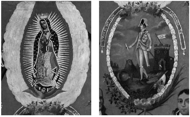 Finalmente, en el centro la imagen de la Virgen de Guadalupe aparece en toda su gloria amparando a Fernando VII,109 cuya efigie se encuentra a los pies de la santa imagen, insertada en un óvalo ricamente decorado, ataviado distinguidamente “a la francesa” (con casaca larga, calzón, chupa, medias y zapatos con hebillas doradas) portando el Toisón de Oro, la banda de la Orden de Carlos III, blandiendo firme con sus manos el bastón de mando y la espada (enfundada), de pie en un campo fértil con cielo nublado donde predomina la vista de un torreón amurallado (España) en el que se distingue firme y al viento el pabellón español. A los pies de Fernando, el león (el pueblo español) protege con una de sus garras los dos orbes, y con la otra se sostiene altivo; y el monarca, mientras observa sereno a lontananza, pisa con sus plantas al águila napoleónica, justo al lado de un conjunto de armas y emblemas bélicos. El retrato está orlado con una filacteria en que se lee “viva el rey don Fernando VII”, rematada su parte inferior con una rama de olivo y otra de laurel, entrecruzadas por una guirnalda de rosas, mismas que adornan las plantas de Guadalupe (véanse las imágenes 20 y 21).
