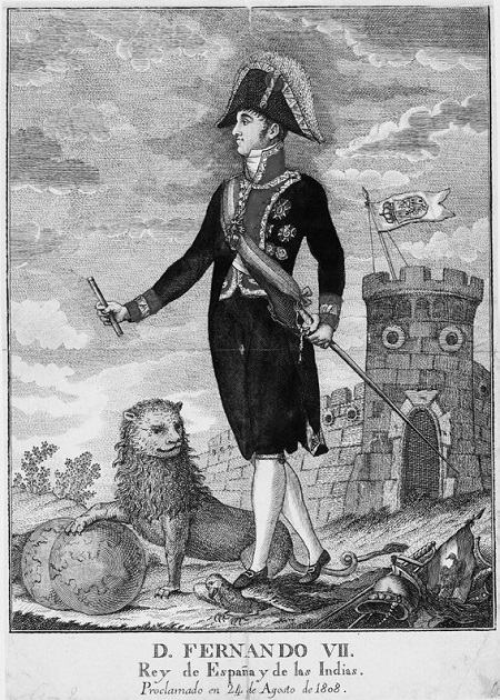 Así evocaba el literato taxqueño don Mariano de Barazábal la personalidad y el desgraciado destino que vivía “el Más amado de los monarcas todos”, el rey Fernando VII. Anunciado como un ejercicio de imaginación en que se invitaba a los lectores del Diario de México a conjeturar “un emblema de pintura en que se manifieste el augusto joven Fernando VII, con signos de cautiverio”, el autor de aquel panegírico ponía en evidencia la aceptación popular que el discurso monárquico fernandino había fomentado entre el pueblo novohispano. Y es que la noticia del advenimiento de Fernando VII al trono simbolizó para muchos la promesa de un futuro mejor para la Monarquía española como no se había visto en años, pues la injerencia del ministro de Estado, y valido de Carlos IV, Manuel Godoy, la había sumido en el desastre.32 Aunque la realidad no era errada, esas aseveraciones maniqueas formaban parte de un largo proceso de construcción apologética en torno a la personalidad e imagen del príncipe de Asturias, a quien se supuso como inocente víctima de los maltratos y desprecio de Godoy, que pretendía impedirle ascender al trono.33