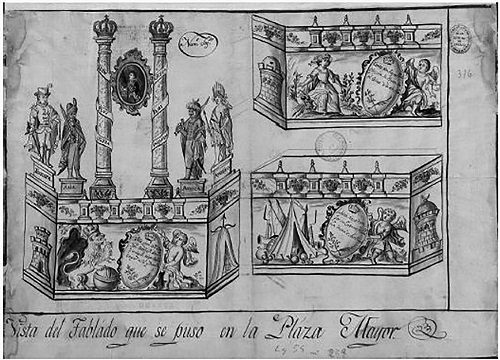 A este respecto, durante los meses de julio y agosto de 1808 en muchas localidades de los reinos de la Nueva España, del Perú, de la Nueva Granada, del Río de la Plata, entre otros, las autoridades político-religiosas, en conjunto con los habitantes de aquellas poblaciones, aderezaron ricamente los balcones y fachadas de palacios, templos, conventos, casas y plazas con la efigie de Fernando VII.45 La organización de la jura al rey debía realizarse en un espacio céntrico, presidido por una plataforma o tablado en el que los artífices evocarían las extraordinarias cualidades del monarca mediante sermones y efímeras representaciones alegóricas, emblemas y jeroglíficos que respaldaban su poder omnímodo, así como el afianzamiento y legitimidad de las autoridades que gobernaban en su nombre.