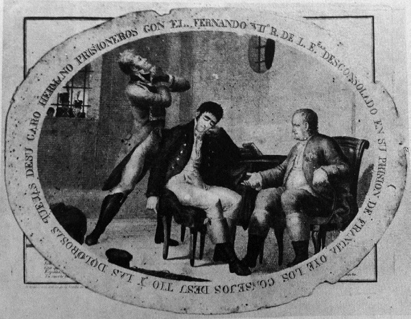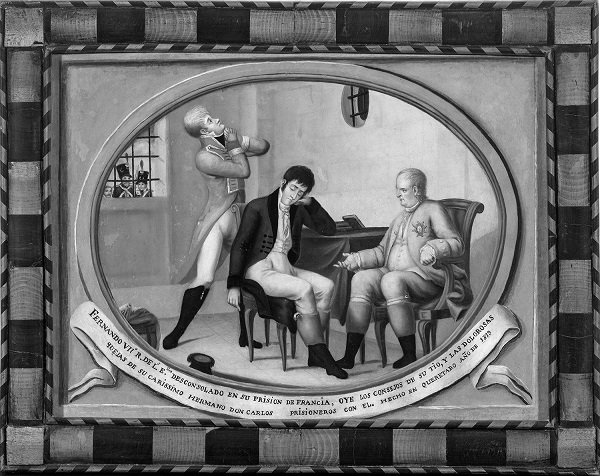 Esta pintura, datada hacia 1819, exponía la trama más importante de la historia fernandina: las congojas del rey y sus familiares durante su reclusión en un “calabozo” celosamente vigilado por las tropas de Napoleón. A decir del discurso encomiástico, Fernando, quien desde niño había sido objeto de diversos sinsabores y pesares (entendidos como un camino proyectado por la Providencia para forjar su carácter como noble y soberano), aceptó gustoso aquella prisión en bien de su pueblo y pervivencia de la monarquía. El contexto, los gestos y los detalles que aparecen representados en esta bella pintura dan fe de la preeminencia de aquel discurso laudatorio en el que quedaron asentadas las virtudes morales de los miembros de la casa de Borbón. En el ultrajante encierro Fernando mantiene una pasividad melancólica frente a su incierto destino mientras su resignado tío Antonio lo reconforta. Su hermano, el príncipe Carlos María Isidro, mientras tanto, con gesto quirológico que da sentido y relevancia a la experiencia sensorial de quien observa, implora confiado al cielo por su rescate.66