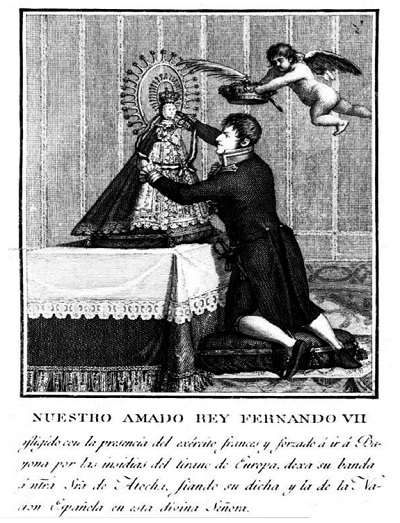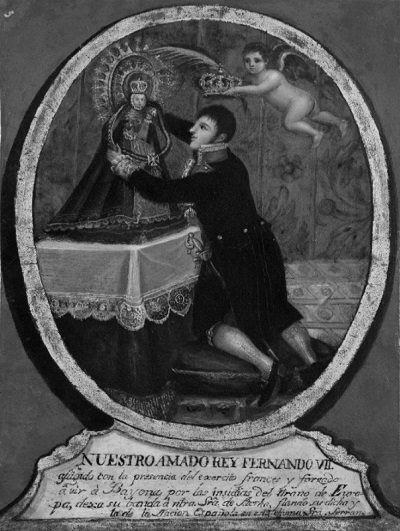 Pero, ¿de dónde salieron esos retratos o efigies? Era de es perarse que la necesidad de conocer e idolatrar la efigie del soberano incitase la imaginación de artistas que no tardaron mucho en preparar y mercar con la multitud insignias, escarapelas y retratos pequeños de Fernando: “rara persona se hallaba sin la insignia del retrato, mote, viva o número 7, y varias llevaban este número en los sombreros o al pecho de piedras montadas.51 Algunos vendedores traían en figuritas de cera bien trabajadas, varios de los pasajes acontecidos en estos días”.52 Se supo, por ejemplo, que en el pueblo de Calpulalpan (perteneciente al obispado de México) don Josef Buenaventura había llevado noticias de los acontecimientos de España, junto con