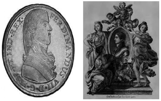 Empero, me es preciso sugerir una revalorización del estudio de las imágenes fernandinas novohispanas dadas las evidencias documentales que actualmente archivos nacionales y extranjeros -en sus instalaciones físicas y plataformas digitales- han aportado y que no han sido del todo consideradas. En efecto, aunque las efigies y estampas fernandinas novohispanas han sido objeto de importantes estudios, pienso que no se ha prestado la suficiente atención a la técnica, variedad, calidad y originalidad de esas efigies. Es decir, preguntarnos -a similitud del caso español- de dónde surgieron los modelos utilizados para crear los primeros retratos oficiales de Fernando que circularon en la Nueva España, quién los realizó, cuál pudo ser su alcance de distribución, así como su reutilización en diversos soportes como libros, monedas, medallas, estampas, blasones, exvotos, cerámica, etc.26 Desde luego, el enfrentarme a la diversidad de documentos y testimonios mencionados, en su mayoría dispersos, resguardados en archivos de difícil acceso, la carencia de métodos de conservación tecnológica, así como su merma por factores humanos o por el paso del tiempo evidenció las razones por las que no ha sido del todo posible dar respuesta a estas preguntas. Por otro lado, esta empresa tuvo su limitante, pues sólo centré mi atención en una selección de retratos de perfil o busto de Fernando VII (impresos como pinturas, estampas, grabados) de cuya circulación en estos territorios tenemos constancia, y no en otros ejemplares (europeos y americanos) en los que aparece la efigie del rey (de cuerpo entero o retrato ecuestre)27 acompañado de una variedad de símbolos y alegorías de mayor complejidad que ya han sido referidos en otras investigaciones.