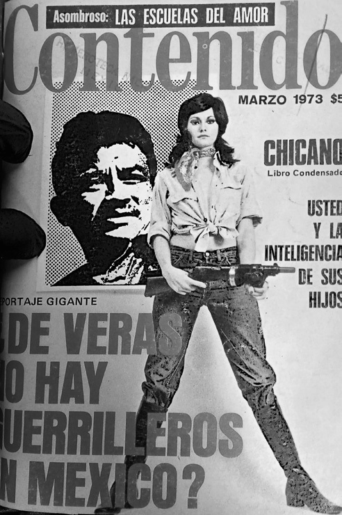 Este conjunto de representaciones fílmicas vino a alimentar una cultura visual en la que la insurgencia guerrillera y la violencia de Estado no sólo no estaban invisibilizadas, sino que eran parte del consumo cotidiano. Sin embargo, como ocurrió con la cinta de Alatriste, muchas de las producciones que visibilizaban la violencia política que se vivía en el campo mexicano se insertaban en lógicas del consumo frenético en las que la politicidad de las imágenes se combinaba con los temas de moda representados regularmente mediante la estética pop que dominaba ya los medios masivos en la década de los setenta. Estas imágenes, que no reproducían el discurso oficial de criminalización de los medios oficialistas, elaboraron representaciones románticas o cómicas, heroicas o denigrantes, con las que los consumidores urbanos configuraron una seguramente caricaturesca imagen de lo que ocurría en las montañas de Guerrero. Entre 1972 y 1974, es decir, durante los años más intensos de la acción guerrillera en el estado de Guerrero, revistas como Sucesos para Todos o Contenido ofrecieron a sus lectores números especiales sobre este tema ilustrados con diseños vanguardistas o incluso con fotografías de atractivas guerrilleras adoradoras de los famosos líderes guerrerenses (véase la imagen 11).