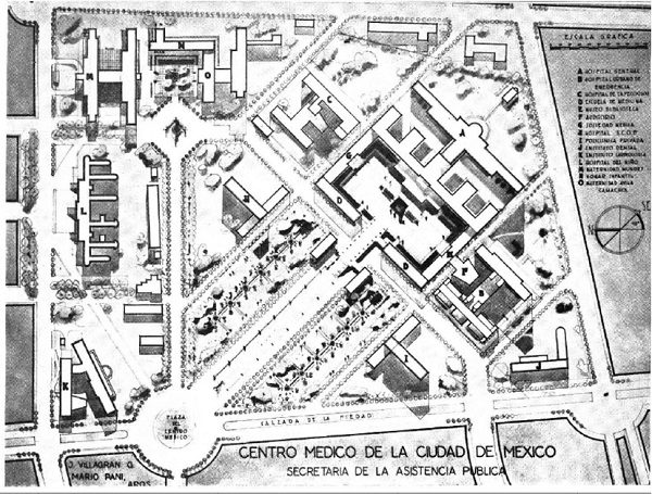 La proyección inicial del Centro Médico estuvo a cargo de los arquitectos Mario Pani y José Villagrán, aunque su realización, como veremos, quedó eventualmente en manos del arquitecto Enrique Yáñez de la Fuente. Todos ellos eran miembros activos del seminario de construcción de hospitales y tenían para entonces una trayectoria reconocida en la construcción de nosocomios públicos.47 De acuerdo a los lineamientos técnicos establecidos por el seminario en el que participaban, el trabajo se dividió en cuatro etapas. En la primera se delimitaría el radio geográfico a servir y se definirían claramente las capacidades, necesidades, personal y equipo necesario para cada hospital; la segunda consistiría en plasmar estas necesidades en un proyecto arquitectónico; después vendría el momento de la construcción; finalmente, en la cuarta etapa se equiparían hospitales y se organizaría su funcionamiento, en el entendido de que continuamente se examinaría la experiencia acumulada para reorganizar el CMN en caso de que fuera necesario.48