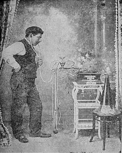 Otro asunto relevante en las observaciones del periodista apunta al desuso que podían tener los audífonos utilizados por los clientes de los fonografistas ambulantes. Sin embargo, debe resaltarse que la inutilidad de estos accesorios ante la capacidad polifónica del diafragma sordo de Ayala, además de alejar a los intrusos y cambiar estas formas comerciales de recepción, de una experiencia individual a otra colectiva, resolvería una de las mayores preocupaciones enfrentadas por las autoridades capitalinas: la transmisión de enfermedades auditivas. Desde 1895 habían aparecido en algunos rotativos los casos de individuos que aseguraban haber contraído una infección en los oídos luego de haber sido cliente de algún fonografista ambulante. Esta situación condujo al consejo de salubridad capitalino a orientar, el 13 de abril de 1895, que todos los que “tienen licencia para la explotación de esos aparatos y á los que en lo sucesivo la soliciten, que deben llevar consigo una solución de ácido bórico al 4% a fin de desinfectar las boquillas” “antes y después que las personas hagan uso de ellas”.27