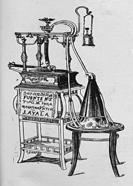 Su versatilidad era indudable. Como mecánico e inventor, Ayala no sólo se dedicaba a reparar todo tipo de artefactos, sino que también perfeccionó y creó determinadas piezas y accesorios. En un anuncio publicado el lunes 4 de mayo de 1903, se informó a los clientes capitalinos que en su local, además de realizarse “todo género de trabajos relativos a latonería, tornería, fundición, dorado, plateado y nikelado”, tenían “especialidad para la fabricación de barandillas, Fuente, adaptables á toda clase de fonógrafos”.14 Para ofrecer confianza a sus posibles compradores e ilustrar las características de este producto, el mecánico se retrató junto a una de sus barandillas.