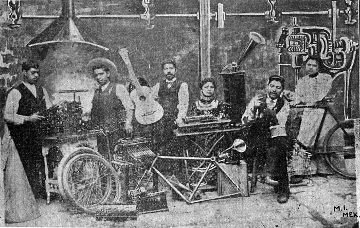 El fotógrafo había captado el negocio en plena actividad. En la acera esperaban varios clientes con bicicletas, mientras el dueño atendía a una mujer que llevó un fonógrafo. Tal vez estaba averiado o la dueña precisó incorporarle algunos de los aditamentos ofrecidos por el dueño del taller. Por esos años, las mujeres no sólo acostumbraban a disfrutar de las máquinas parlantes en la tranquilidad del hogar, sino que también tenemos noticias de empresarias que los rentaban en las calles. Luz Escobar, una de estas emprendedoras, llegó tener en 1903 dos artefactos en explotación.13